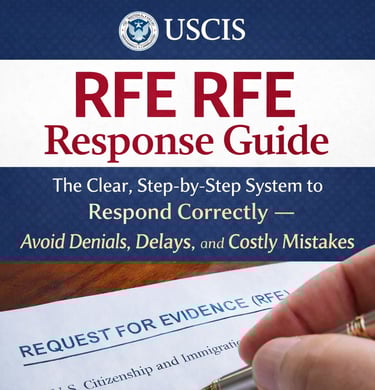 👉 The USCIS RFE Response Guide breaks down RFE language line by line, showing you how to translate USCIS wording into exact response strategy — in over 60 pages of practical, officer-level guidance.